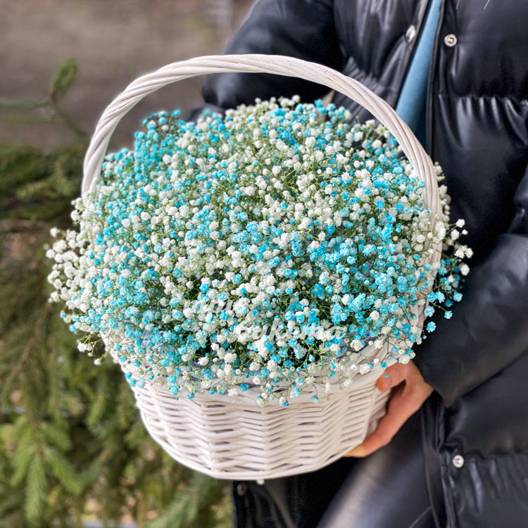 Белые и голубые гипсофилы в корзине