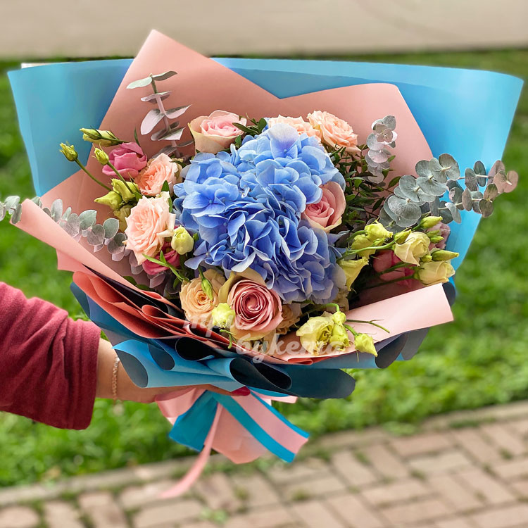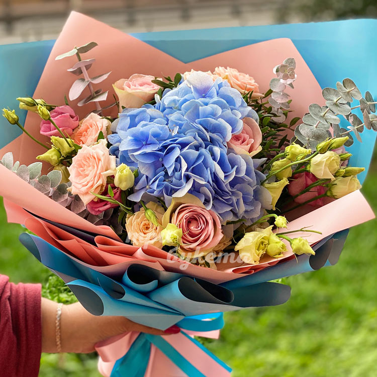 Букет из гортензии, роз и эвкалипта