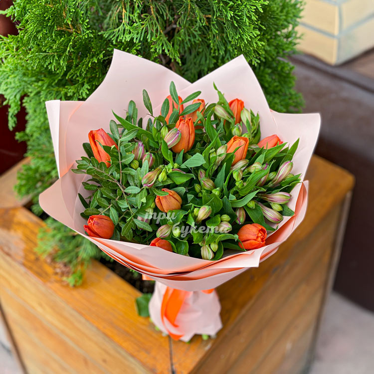 Букет оранжевых тюльпанов с альстромериями