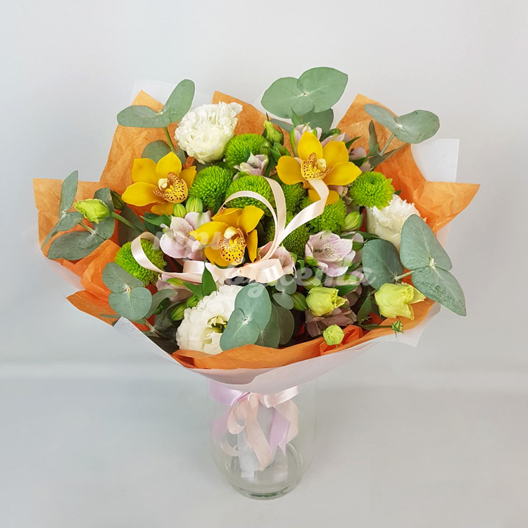 Букет орхидей, хризантем и эустом