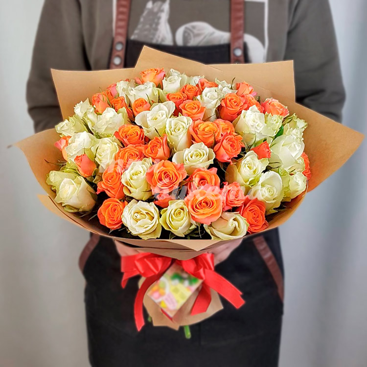 Оранжевые и белые розы в крафте